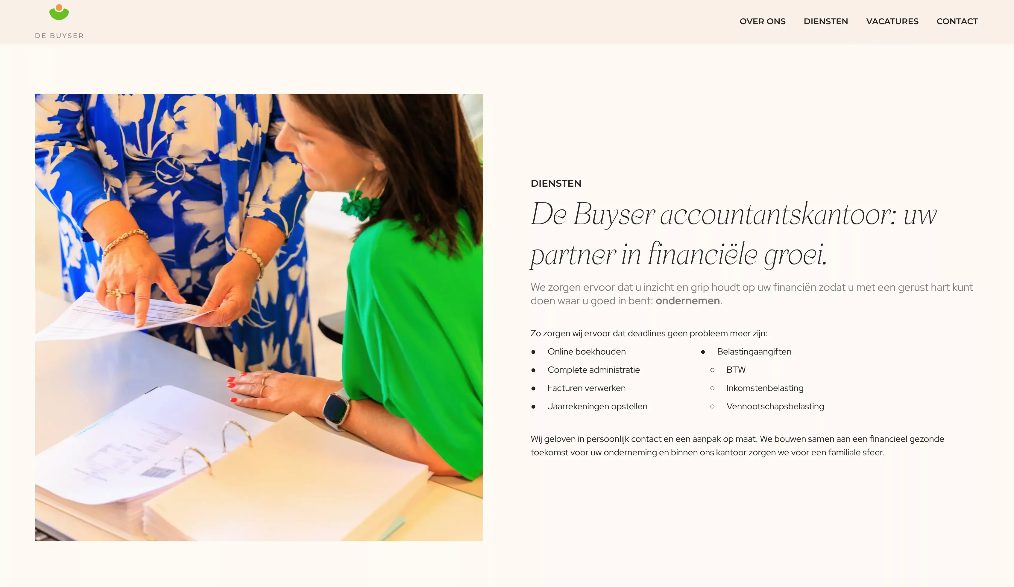 Boekhoudkantoor De Buyser had nood aan een vernieuwde online aanwezigheid. Hun bestaande website en logo waren verouderd en pasten niet langer bij de moderne en professionele aanpak van het bedrijf.